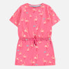 Pink dress with a fun flamingo pattern. Its relaxed fit and short sleeves make it the perfect outfit for warm days. Features an elastic waistband with a decorative drawstring. Made from stretchy cotton jersey.