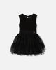 Our Sleeveless Dress with Tulle Skirt Black is absolutely charming in a flared silhouette with ultra-girly details. This special occasion dress features a sleeveless bodice with a round neckline, a stretch elastic waistband that makes it oh-so-comfortable to wear, and a flared tulle skirt with a dot print and little ruffles. It's a perfect choice for the stylish little girl who loves to look chic!