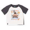 Solid jersey T-shirt. Short sleeves. Shoulder snap button opening and front print.
