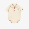 A cream bodysuit with short sleeves, polo collar and button placket with three snap fasteners, made in a soft, stretchy cotton knit with irregular ribbed effect and small patch of a colorful palm tree.