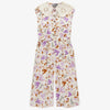 Cream no sleeve one-piece with purple and brown birds pattern in viscose. Fastens with buttons in front.