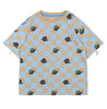 This short-sleeved t-shirt from THE NEW is a fun and stylish piece, featuring an all-over print of smiley faces with caps and peace signs. The background showcases a subtle beige and light blue checkered pattern, adding a unique and playful touch. Perfect for pairing with jeans or shorts for a casual and trendy everyday look.