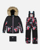 A vibrant floral print adds a sweet touch to our sporty Two Piece Snowsuit Black Printed Roses. Perfect any day of skiing, snowboarding, or sledding, this insulated snowsuit features a fleece-lined coat with articulated sleeves, adjustable elastic cuffs, a snow skirt, and a removable hood with faux fur trim. We've teamed it with removable logo strap snow pants with an elastic waistband, adjustable hems, reinforced panels for long-lasting wear, and shiny reflective accents. A matching neckwarmer is included!