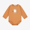 Brown bodysuit with an adorable bear illustration. Features long sleeves, a round neckline, and snap buttons at the crotch for easy dressing. Made from stretch cotton jersey for maximum comfort.