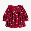 Red dress with long puffed sleeves that will seduce you with its repeated all-over print of small reindeer, foliage and pinecones. Note also the ruffle and gathering details at the front, embellishing the look. The ruffled cuffs are gathered with elastics. The back opens with imitation wood buttons for easy dressing.