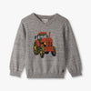 This playful V-neck sweater in grey speckle features a charming tractor design on the front, adding a fun touch to cozy comfort.