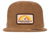 The Coxos snapback hat has brown corduroy paneling and features a branded "BinkyBro Board Co Sunset Arch" embroidered logo. This hat is 95% cotton and 5% spandex.