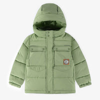 GREEN PUFFER COAT WITH HIGH COLLAR AND HOOD, CHILD