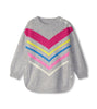 Grey tunic-style jumper for girls by Canadian brand Hatley, knitted in a super soft cotton blend. For a vibrant pop of colour, it is patterned with chevron stripes in pink, blue, yellow and white. Glittery button fastenings on the shoulder and split side seams add a stylish touch and the hem is shaped to complete the look.
