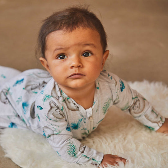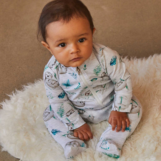 An allover sloth print adds one-of-a-kind style to our Printed Pajamas Light Grey Mix. This one-piece footie is made from soft extensible cotton fabric and features a comfortable fit with long sleeves, attached feet, a round neckline, and an asymmetrical zipper placket.