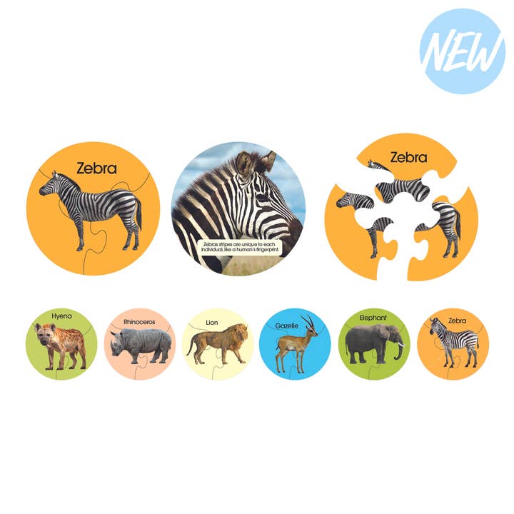 Discover the charm of the safari with BeginAgain's Safari Animal Puzzles! These delightful 3-piece puzzles, each with a 5-inch diameter, bring the safari to life. Flip them over to find fun facts about each animal on the back, adding an educational twist to playtime! Made in the USA and designed for ages 2 and up, these engaging puzzles ignite curiosity and foster early learning while celebrating the wonders of safari life! Each case of these comes with a wooden display stand for free to make displaying them an ease.