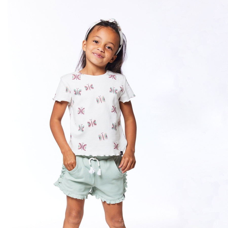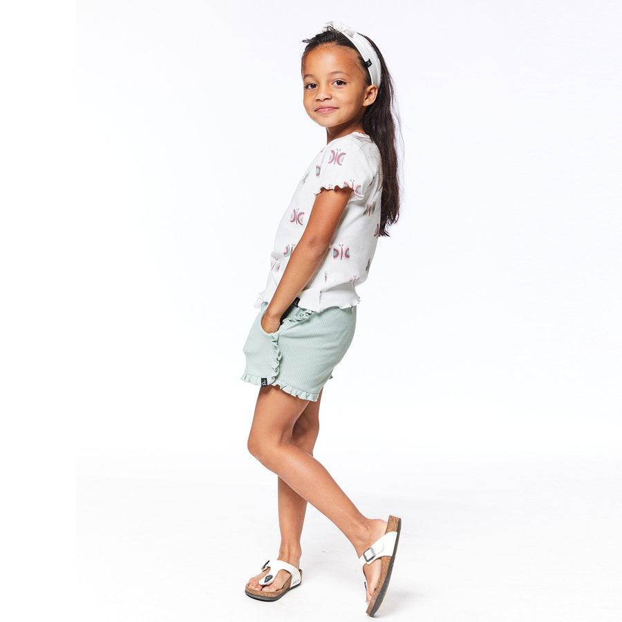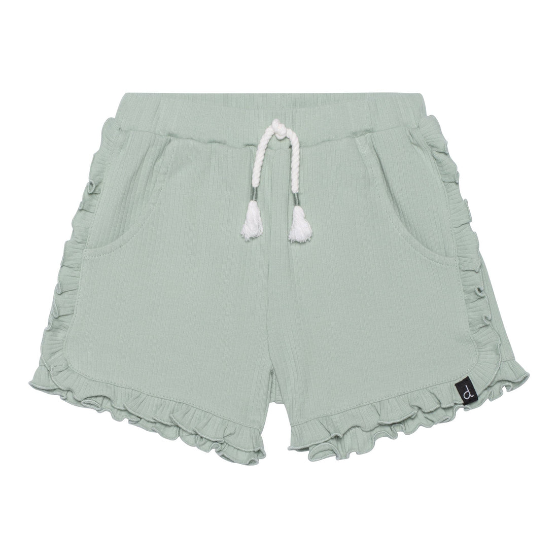 Our Short With Frill Frosty Green is a must-have for the girl who likes her basics with a twist. This comfortable pull-on short is made from a stretch cotton/elastane blend and features an elastic waistband with a rope tassel tie, ruffles down each side and around the hem, and scoop pockets at each hip.