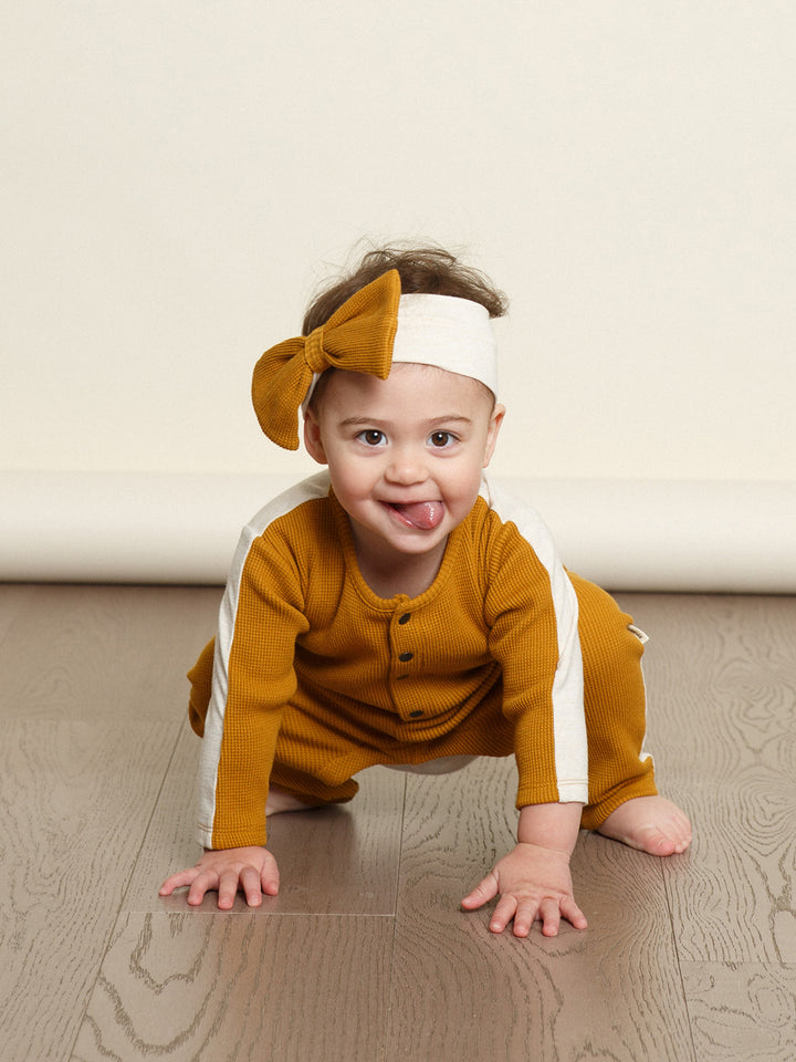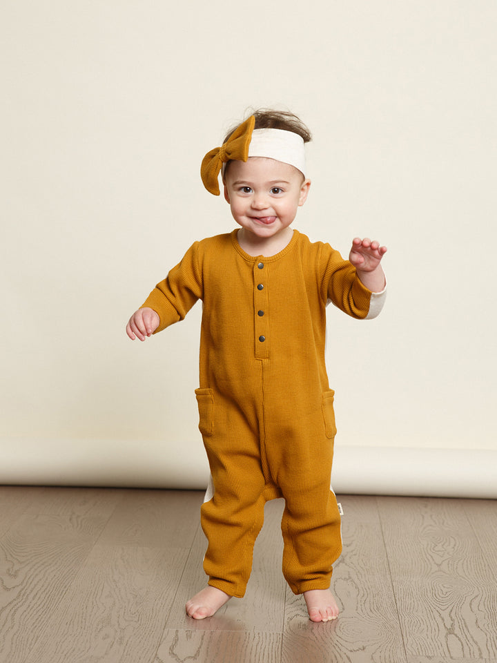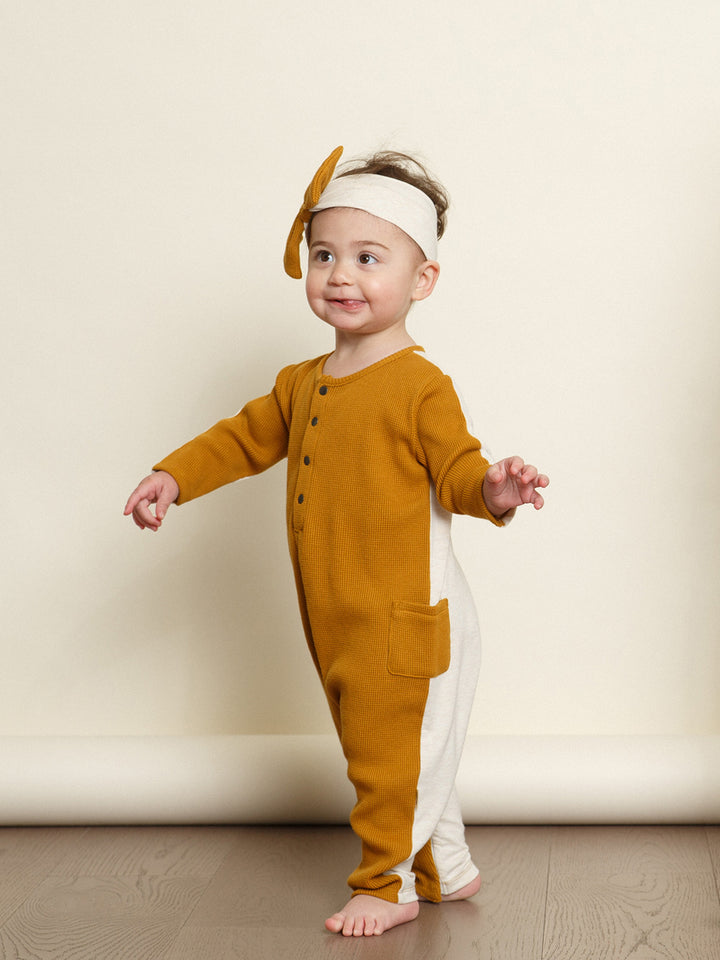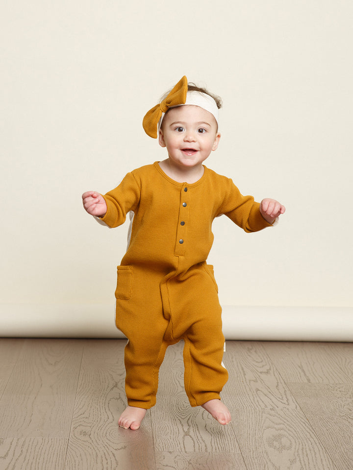 Our best-selling romper is back for Fall in organic cotton waffle with a soft bamboo jersey back.